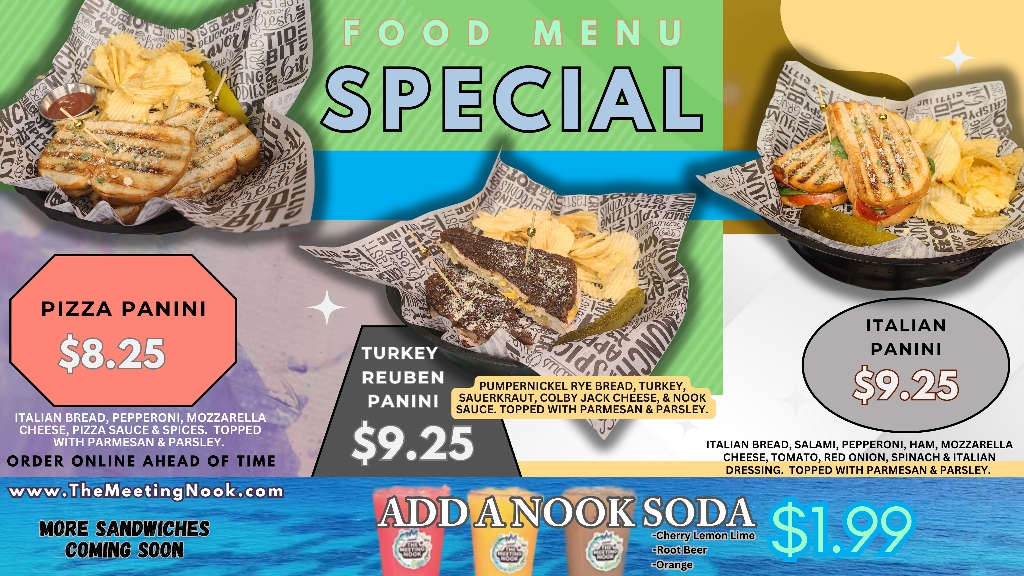 The Meeting Nook in Dell Rapids has started serving paninis. Options include pizza, Italian and turkey Reuben, and the shop is working on other varieties. Each order comes with chips and a pickle. The shop is open from 2 to 6 p.m. Thursday, Friday and Sunday and 10 a.m. to 2 p.m. Saturday, but curbside pickup also is available for online orders from 11:30 a.m. to 2 p.m. weekdays.