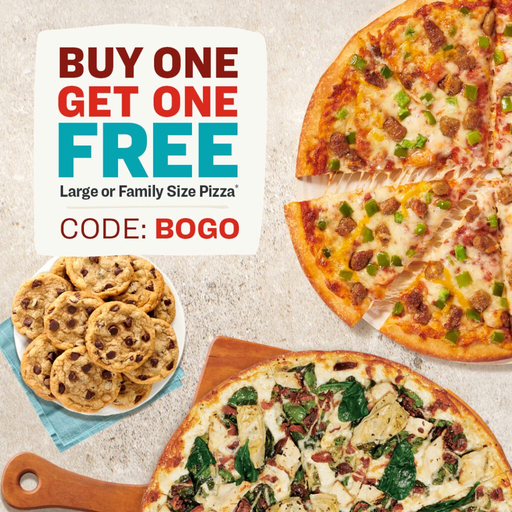 Papa Murphy’s has a BOGO special through Monday. Buy a large or family-size pizza online, and get any pizza of equal or lesser value for free. Use the code BOGO.
