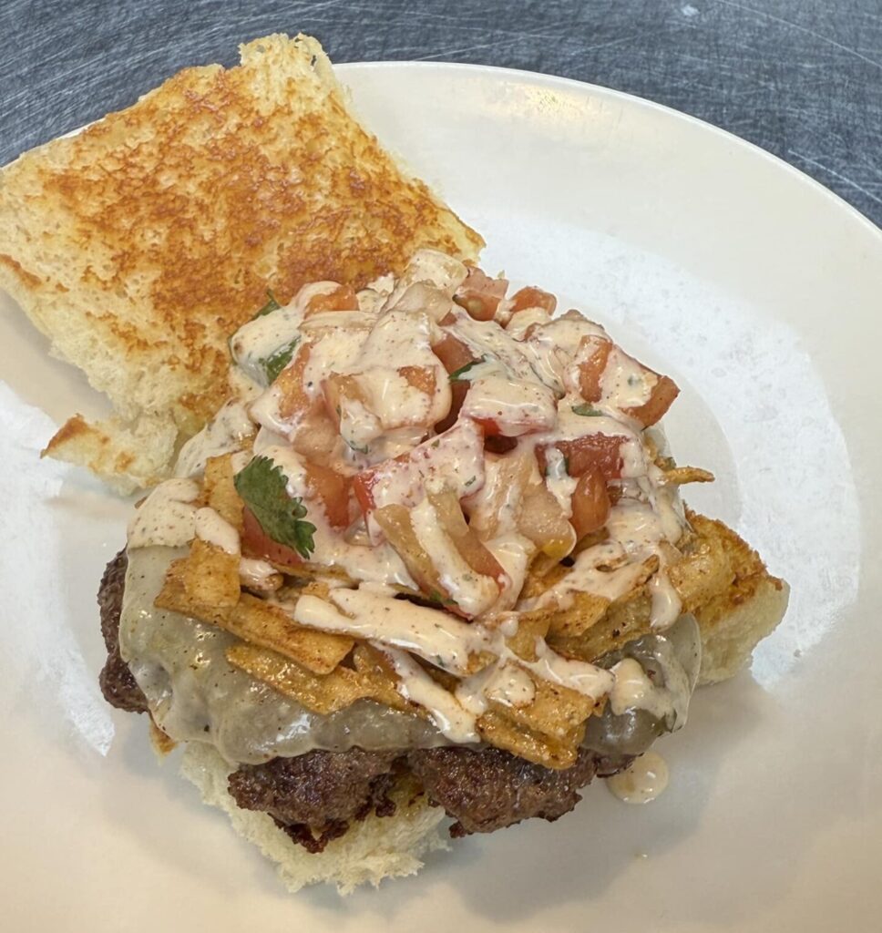 - Alibi Bar & Grill: The Sante Fe Burger is a one-third pound patty topped with pepper jack cheese, pico de gallo, spicy ranch sauce and tortilla chips, served on a toasted Breadsmith bun. It’s $11 and comes with your choice of side.