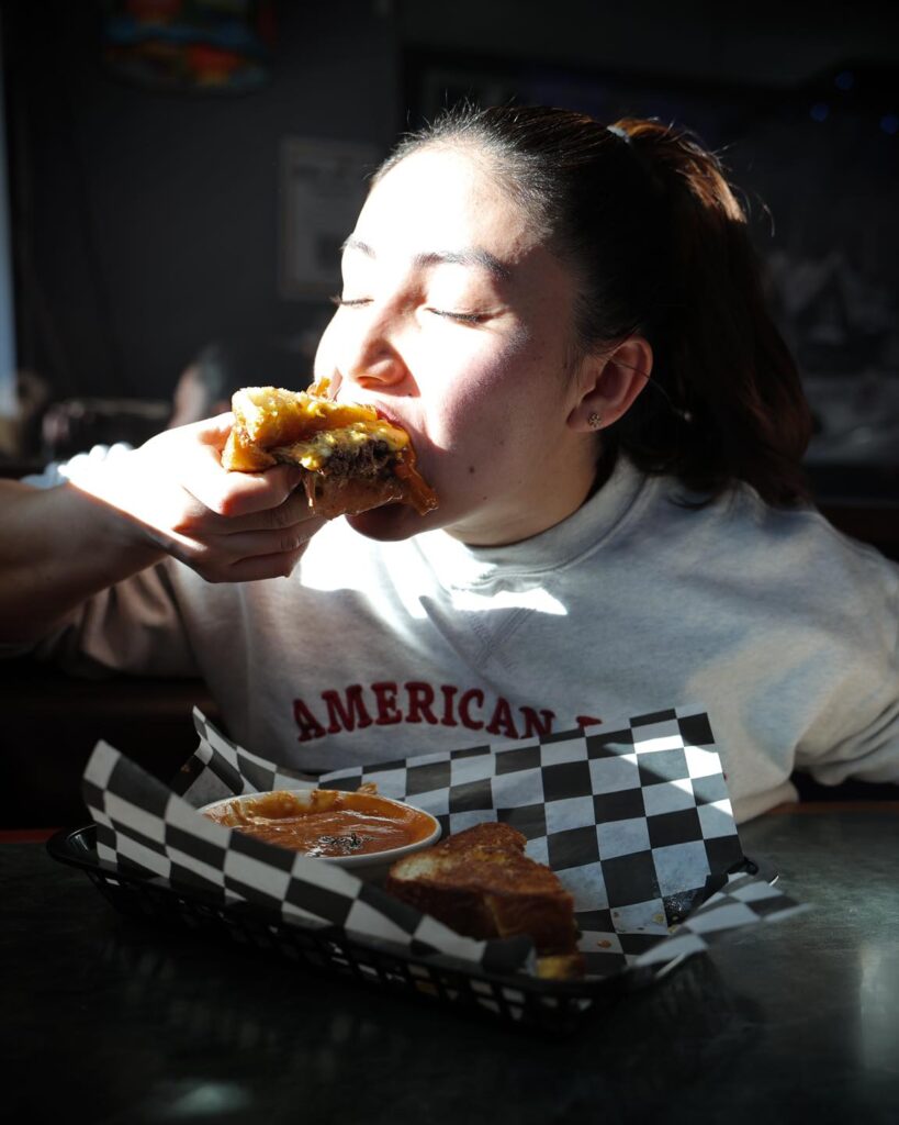 - Big Sioux Burger: The Grilled Cheese Burger has two smashed patties, American and cheddar cheeses, cheddar aioli and sliced tomato on griddled milk bread. It’s served with tomato soup for dipping.