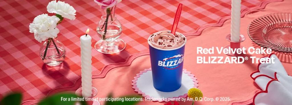 DQ Grill & Chill’s Blizzard of the Month is Red Velvet Cake. DQ soft serve is blended with pieces of cake and cream cheese icing.