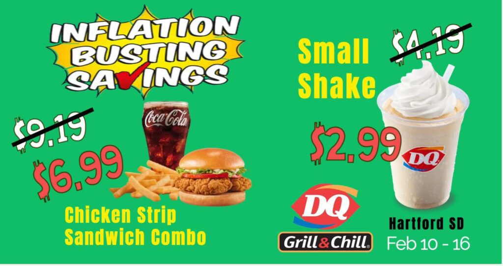The DQ Grill & Chill in Hartford is back with more Inflation Busting Savings through Sunday. This week’s offers are a regular or spicy chicken strip sandwich combo for $7 and a small shake for $3.