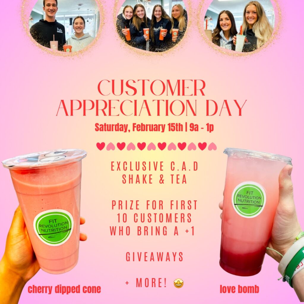 Fit Revolution Nutrition is celebrating Customer Appreciation Day from 9 a.m. to 1 p.m. Saturday. Find Valentine’s-themed drinks, giveaways and a special prize for the first 10 customers who bring a friend. Sister locations The Drop Nutrition and Refuel will be closed Saturday to join in the fun at Fit Revolution Nutrition.