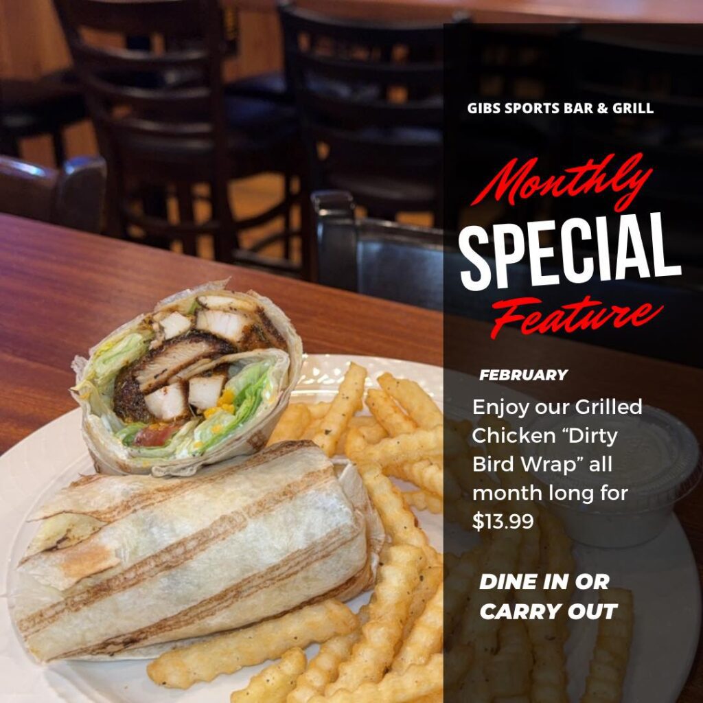 Gibs Sports Bar’s special for February is the Dirty Bird Wrap. It features the same grilled chicken used in the restaurant’s signature Papa’s Creamy Cajun Chicken Pasta. It comes with tots or fries for $14.