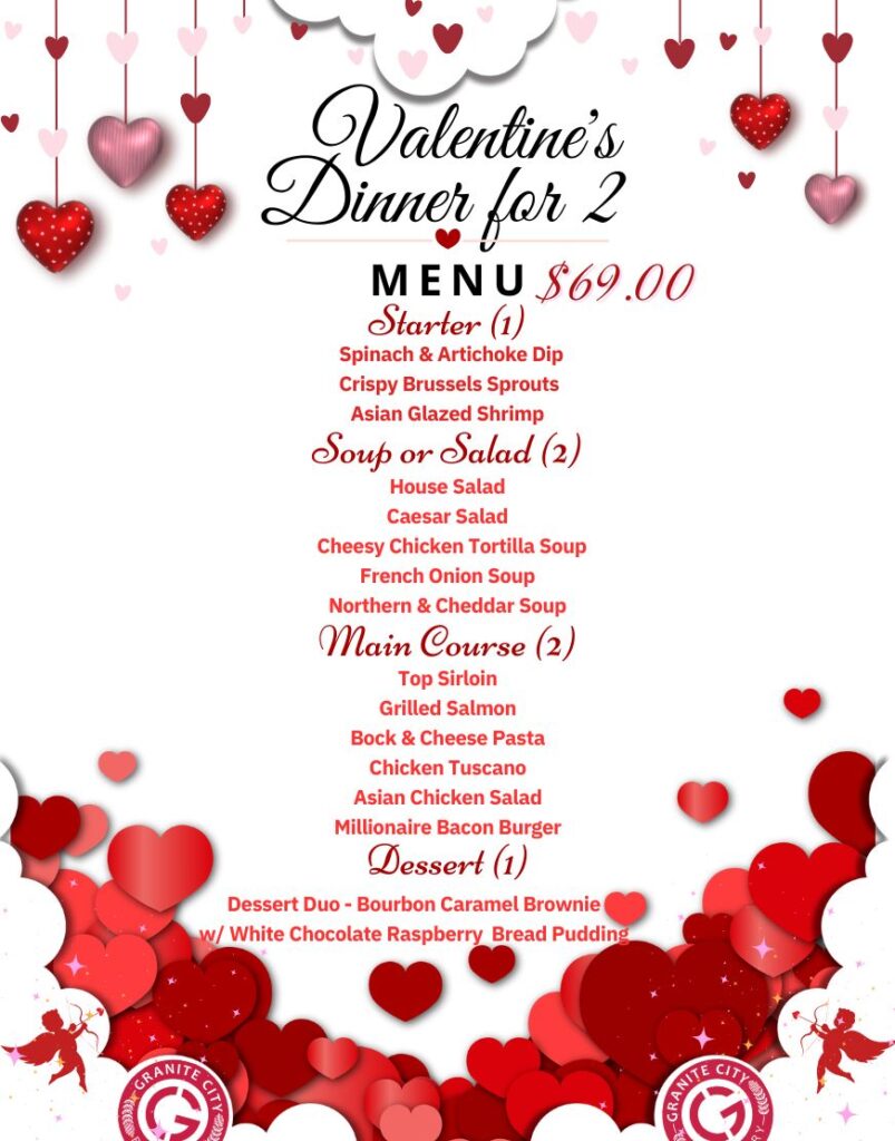 Granite City Food & Brewery offers lots of choices with its four-course dinner for two, which will be served Friday through Sunday. Reservations are almost full on Friday, but the meal is available for takeout too. If you’re dining in, add a bottle of champagne or pitcher of Granite City beer for $12.