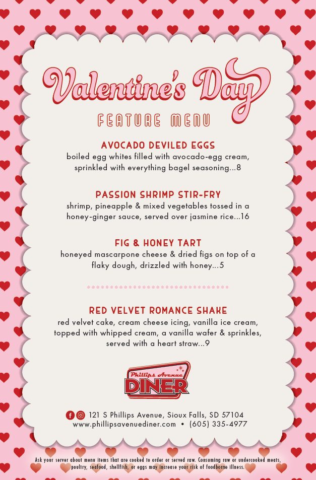 And if you’re not inclined to go out at night, The Cookie Jar Eatery has a Valentine’s Day lunch special. Get a flatbread pizza – pepperoni, cheese or chicken bacon ranch – two drinks and two desserts – cookies or slices of French silk or apple pie – for $20. Email cookiejarsd@gmail.com with a preferred time to reserve a spot.