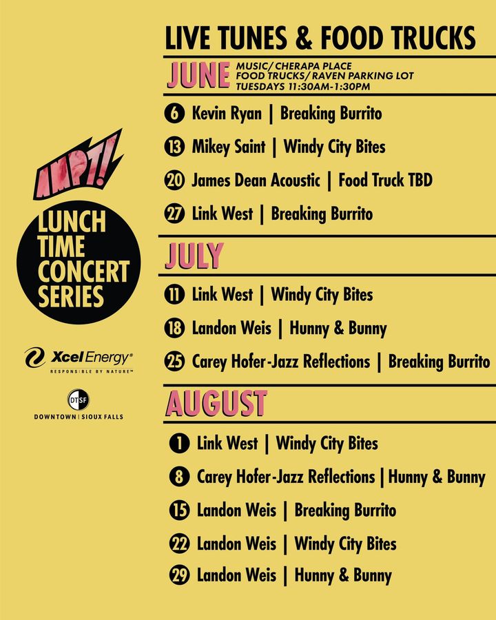 Find one of three food trucks – Breaking Burrito, Hunny & Bunny and Windy City Bites –– every Tuesday at the AMPT concert series at the Cherapa Amphitheater along the east bank of the Big Sioux River between Sixth and Eighth streets. The food trucks will be across the pedestrian bridge in the Raven Industries parking lot. Live music and food will be available from 11:30 a.m. to 1:30 p.m. Editor’s note: This item was corrected to reflect that the food trucks will rotate.