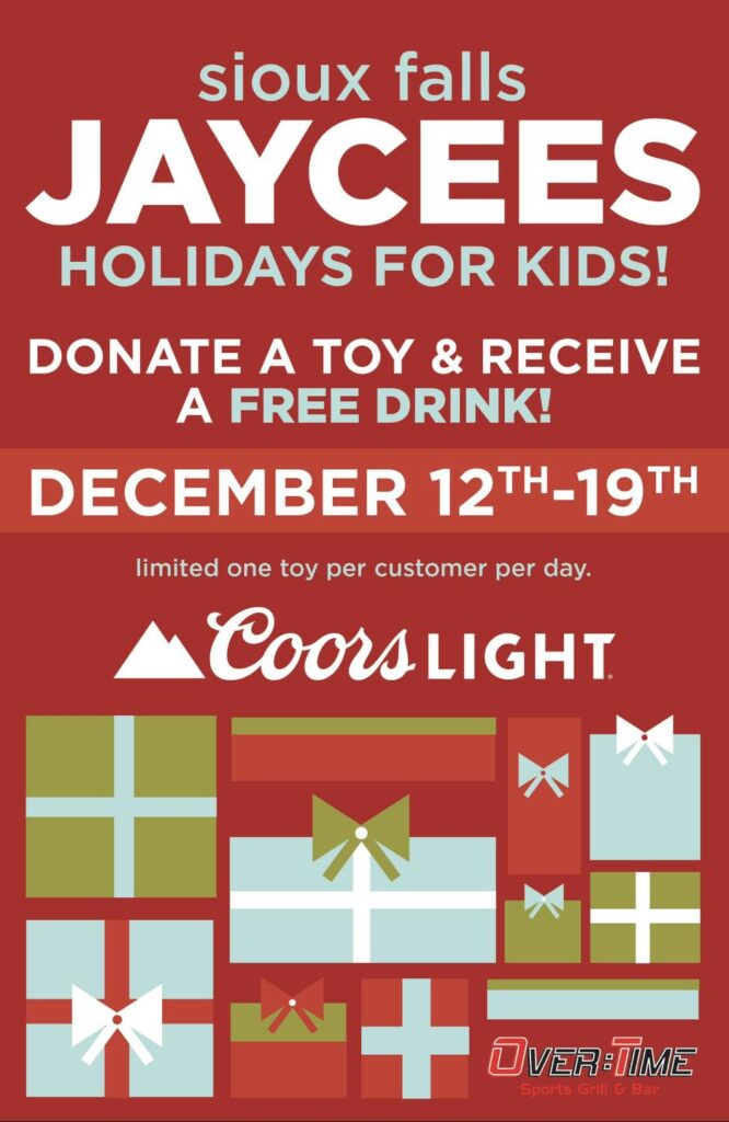Bars that are part of the M.G. Oil family are offering a free drink with the donation of an unwrapped new toy through Dec. 19. That includes Billy Frogs, Liebrary Bar, Overtime Sports Bar & Grill, The 18th Amendment, The Red Eye Bar & Casino, Detour Bar and The Alpine Inn.