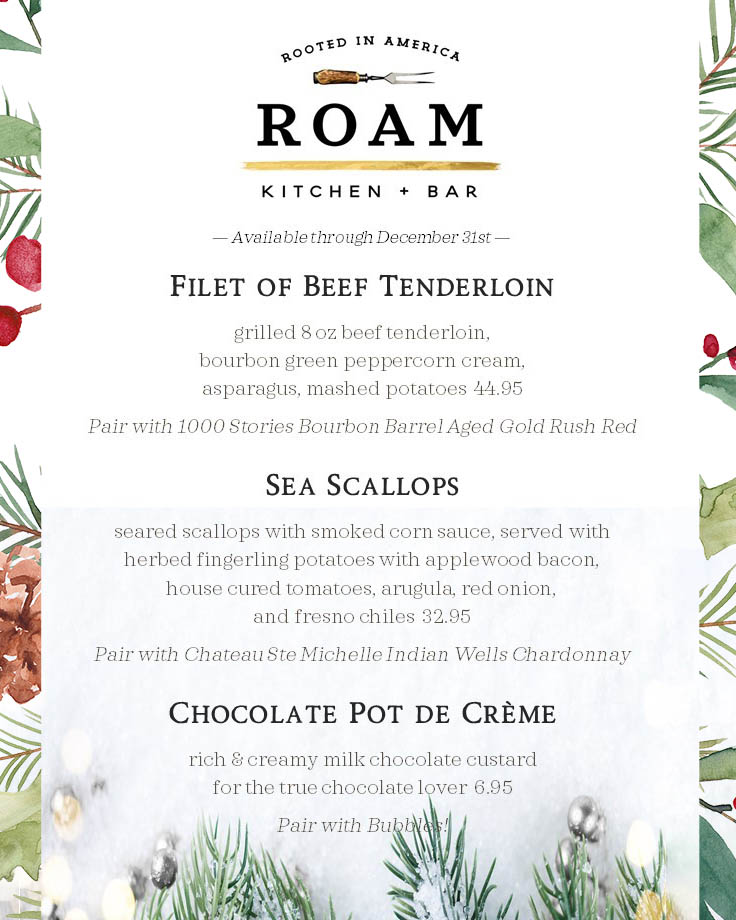 Roam Kitchen + Bar has two featured entrees and a seasonal favorite for dessert this month. Choose an 8-ounce beef tenderloin filet or sea scallops. Finish off the meal with Chocolate Pot de Creme.