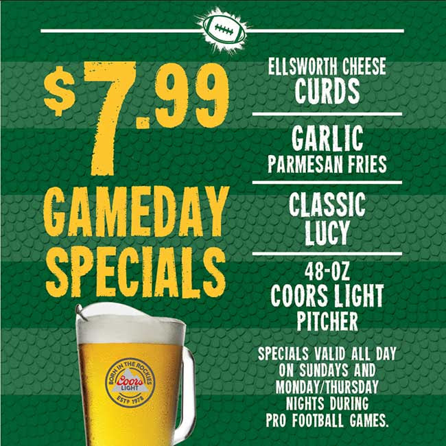 Crooked Pint Ale House is offering game day specials during pro football games. For $8, get cheese curds, fries, a classic Lucy or a pitcher of Coors Light. The restaurant has 21 big-screen TVs.