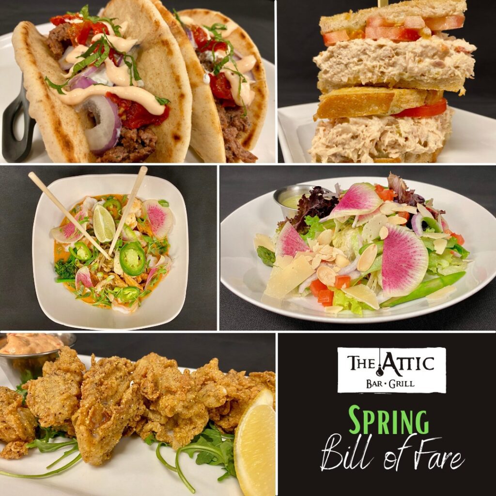 The new Bill of Fare menu at both locations of The Attic Bar & Grill embraces seafood for Lent. Options include Cajun fried oysters, a Havarti tuna melt and a Thai curry shrimp bowl. There’s also a Greek spin on a taco with ground lamb and beef served on a grilled pita with tzatziki sauce, spicy sour cream, marinated tomatoes, red onion and a mint chiffonade. Go light with the asparagus and watermelon radish salad, or indulge with a slice of lemon raspberry cheesecake from The Cake Lady.