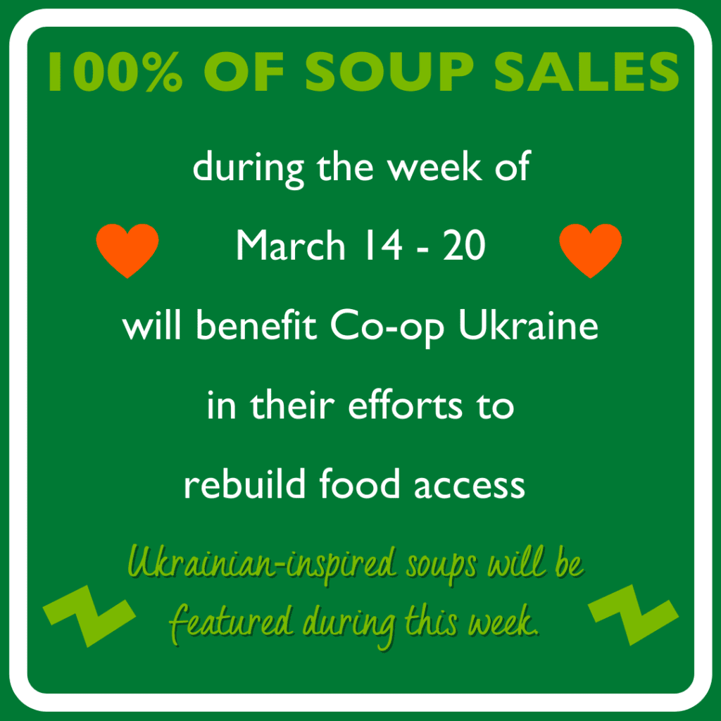 Buy a bowl of soup at the Sioux Falls Food Co+op’s hot bar through Sunday at all proceeds will benefit Co-op Ukraine and its efforts to rebuild food access in the war-torn country. The kitchen crew is offering two Ukrainian-inspired soups: borscht, which is vegan and gluten-free, and pork rib and sauerkraut, which is gluten-free. The soup is available from 11 a.m. to about 7 p.m.