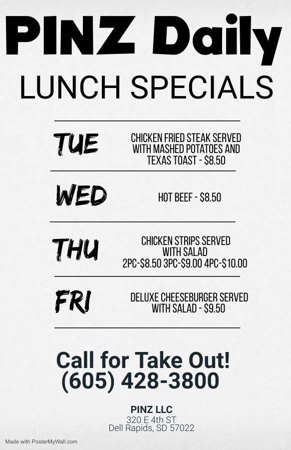 Pinz, the Dell Rapids entertainment venue that offers bowling, darts and arcade games, reopens Tuesday after its summer break. The kitchen is open from 11 a.m. to 9:30 p.m. Tuesday through Friday, 8 a.m. to 9:30 pm. Saturday and 8 a.m. to 7 p.m. Sunday. On Saturday, breakfast is served until 10:30 a.m., and on Sunday, it’s served until 1:30 p.m. The dinner menu also is available beginning at 11 a.m.