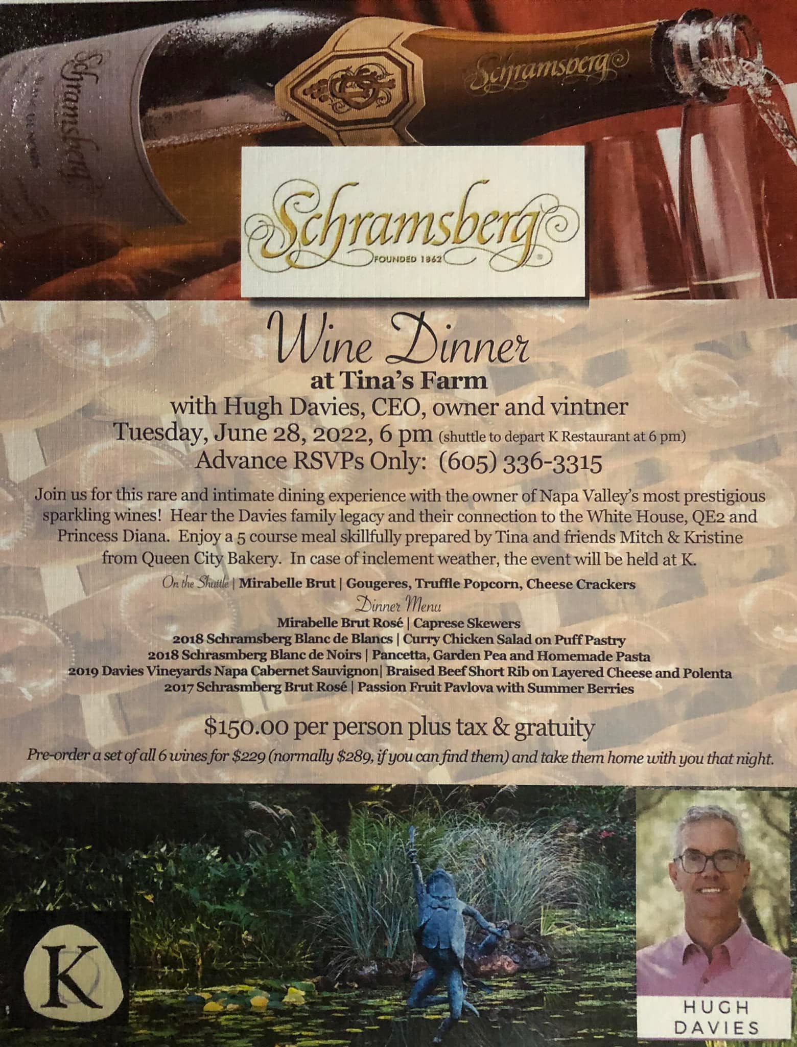 This sounds like a fun night out, if you can snag a spot! K Restaurant is coordinating a wine dinner on June 28 at Tina’s Farm near Baltic. Board a shuttle at Queen City Bakery and enjoy a dining experience with the owner of one of Napa Valley’s most prestigious sparkling wines. It’s a five-course meal and space is limited. Call K Restaurant at 605-336-3315 to reserve your place.