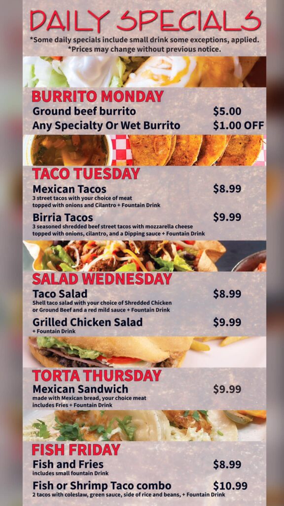 Jacky’s Restaurant in The Empire Mall has added a daily weekday special. Get discounts for Burrito Monday, Taco Tuesdays, Salad Wednesday, Torta Thursday and Fish Friday.