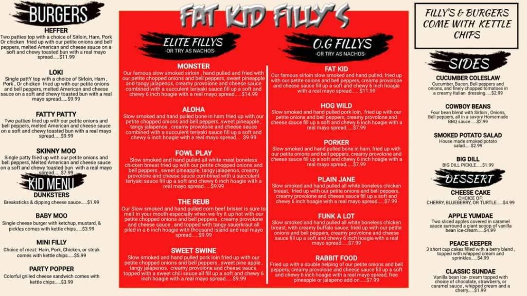 Fat Kid Filly’s makes its debut Friday night at Bushwhackers Bar & Grill. The food truck is taking over the bar’s kitchen on select dates, with a regular schedule expected later in the year. For Friday night, Fat Kid Filly’s owner Cody Sauers also is cooking up a St. Patrick’s special of smoked corned beef, cabbage, potatoes, carrots and a dinner roll. Here’s a look at the regular menu, which includes a rainbow-colored grilled cheese for kids called the Party Popper.