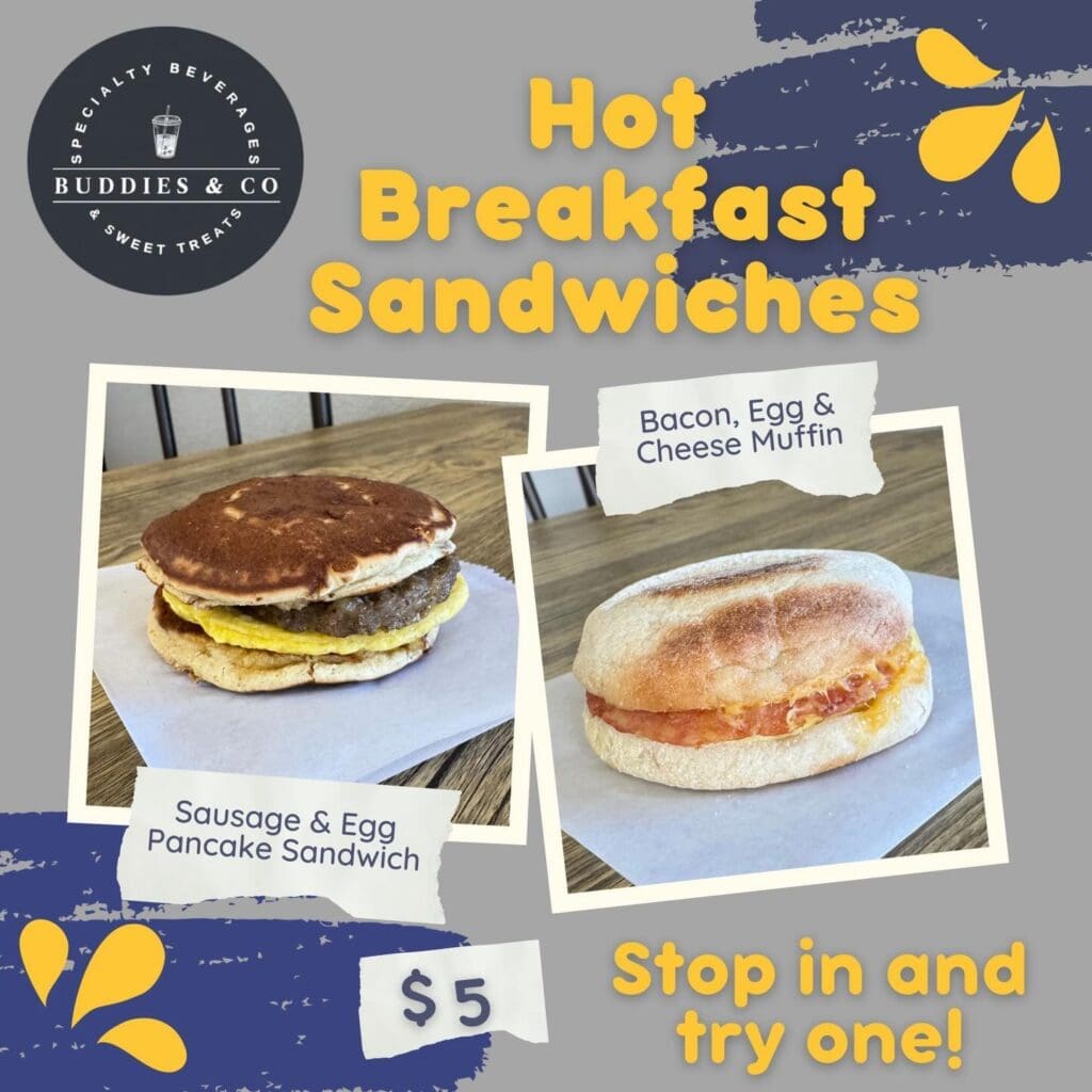 Buddies & Co. in Brandon has added two hot breakfast sandwiches to the menu: Sausage & Egg Pancake Sandwich and Bacon Egg & Cheese Muffin. The price is $5 each.