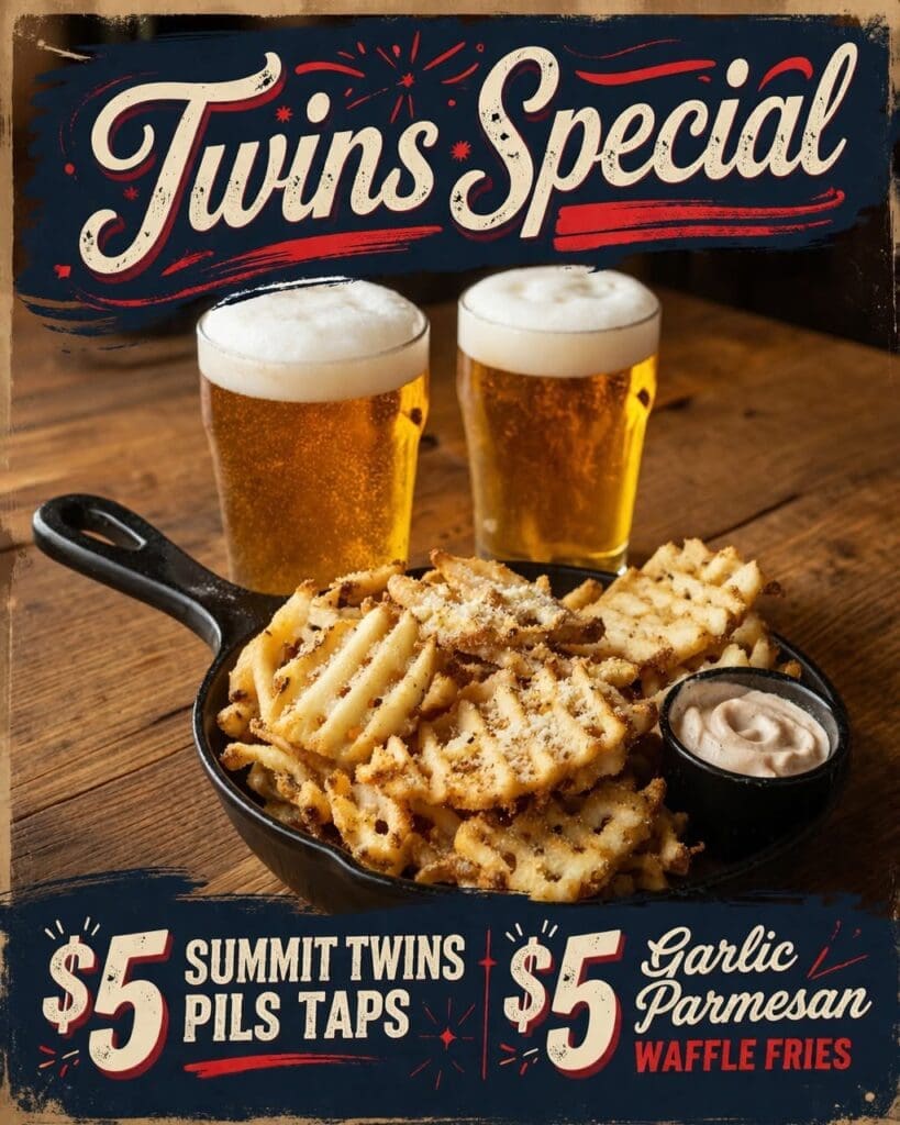 Catch a Minnesota Twins broadcast at Crooked Pint Ale House this month and next, and get Summit Twins Pilsner taps and Garlic Parmesan Waffle Fries for $5 each.