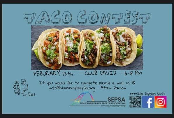 Club David is hosting a taco-making contest Saturday for the Sioux Empire Pride Sports Association. It’s $5 for an all-you-can eat meal from 6 to 8 p.m. To enter the contest, send an email to info@siouxempirepsa.org, with “attention Damon” in the subject line.