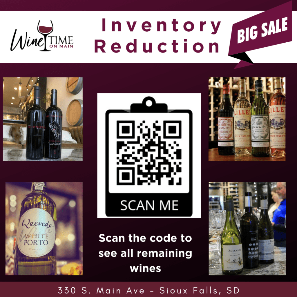 Wine Time on Main is open until 7 tonight, selling only bottles of wine to go, and after that will be open by appointment only until the end of the month. Call 605-360-7126 for an appointment.