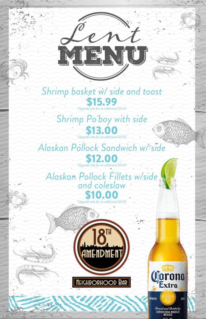 - The 18th Amendment has a special menu for lunch and dinner on Fridays during Lent with several fish and shrimp offerings.