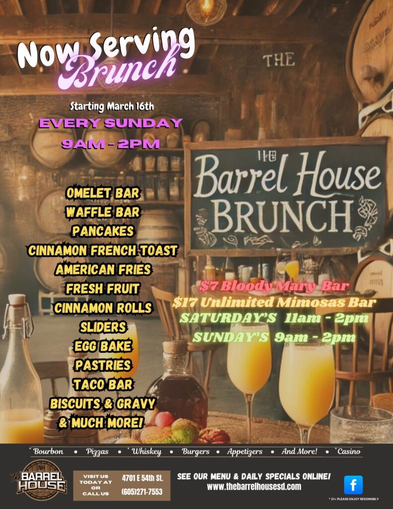 The Barrel House is adding a brunch buffet on Sundays beginning this weekend. Prices will be $25, with a 10 percent discount for those 65 and older, and $15 for those 12 and younger. Hours will be 9 a.m. to 2 p.m. There also will be bloody mary bar for $7 and an unlimited mimosa bar for $17. Those also are available from 11 a.m. to 2 p.m. Saturday.