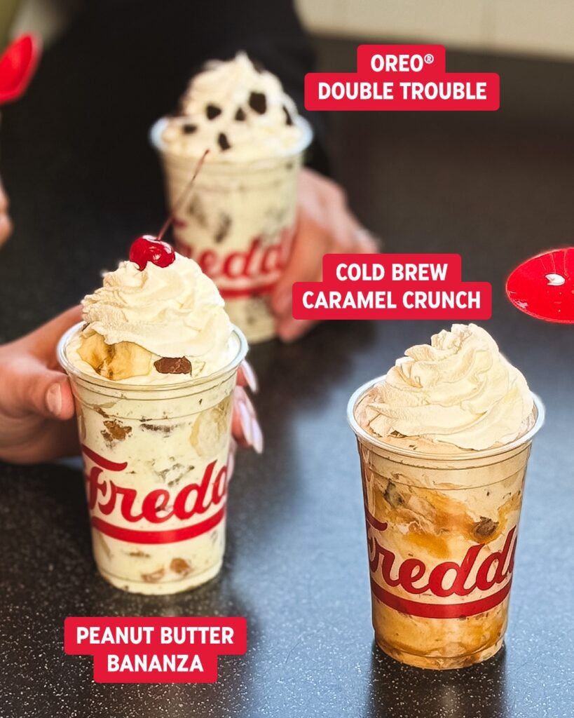 Three limited-time features at Freddy’s Frozen Custard & Steakburgers have been added to the menu year-round: Grilled Cheese Steakburger, Prime Rib Steakburger and Tots. Also back by popular demand are Lemon Cream Frost, Orange Cream Frost and The Peanut Butter Bananza, formerly known at the PBC&B. New frozen custard treats are Cold Brew Caramel Crunch, Reese’s Royale, Oreo Double Trouble and Strawberry Dreamcake. A new side option is Freddy’s Kettle Chips, which are seasoned with Freddy’s Fry Seasoning.