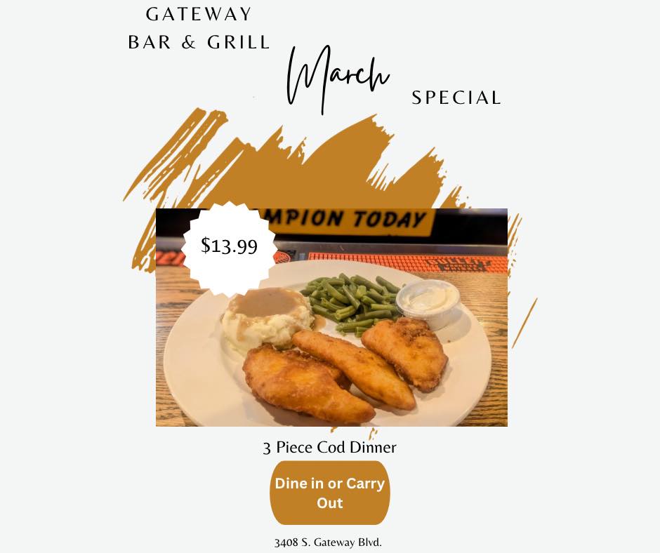 - Gateway Bar & Grill’s March special is a three-piece cod dinner for $14. It’s available daily for dine-in or carryout.