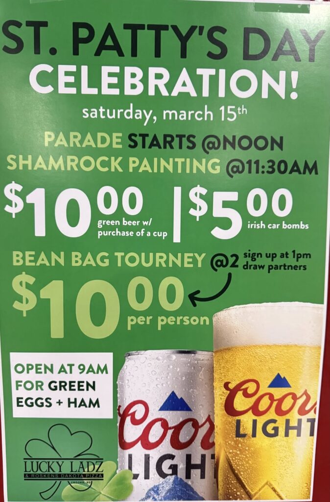 If you want to celebrate St. Patrick’s Day early, you’ll find lots of opportunities Saturday. Here’s one with a charitable connection: Lucky Ladz in Crooks, the former Critters Bar, is having a potluck starting at noon. Freewill donations will go to Midwest Honor Flight. There’s also a shamrock painting at 11:30 a.m. outside the bar and a parade at noon. If you want to start even earlier, there’s green eggs and ham at 9 a.m.