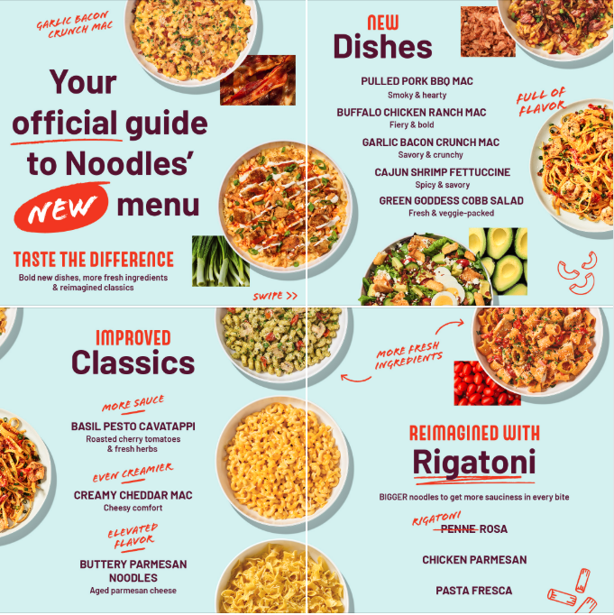 Noodles & Company has overhauled its menu with new dishes and “reimagined” classics. What’s new? Pulled Pork BBQ Mac, Buffalo Chicken Ranch Mac, Garlic Bacon Crunch Mac, Cajun Shrimp Fettucine, Green Godess Cobb Salad and Lemon Parmesan Broccoli. If you’re a fan of Steak Stroganoff, it’s “leaving soon,” according to the restaurant’s website.