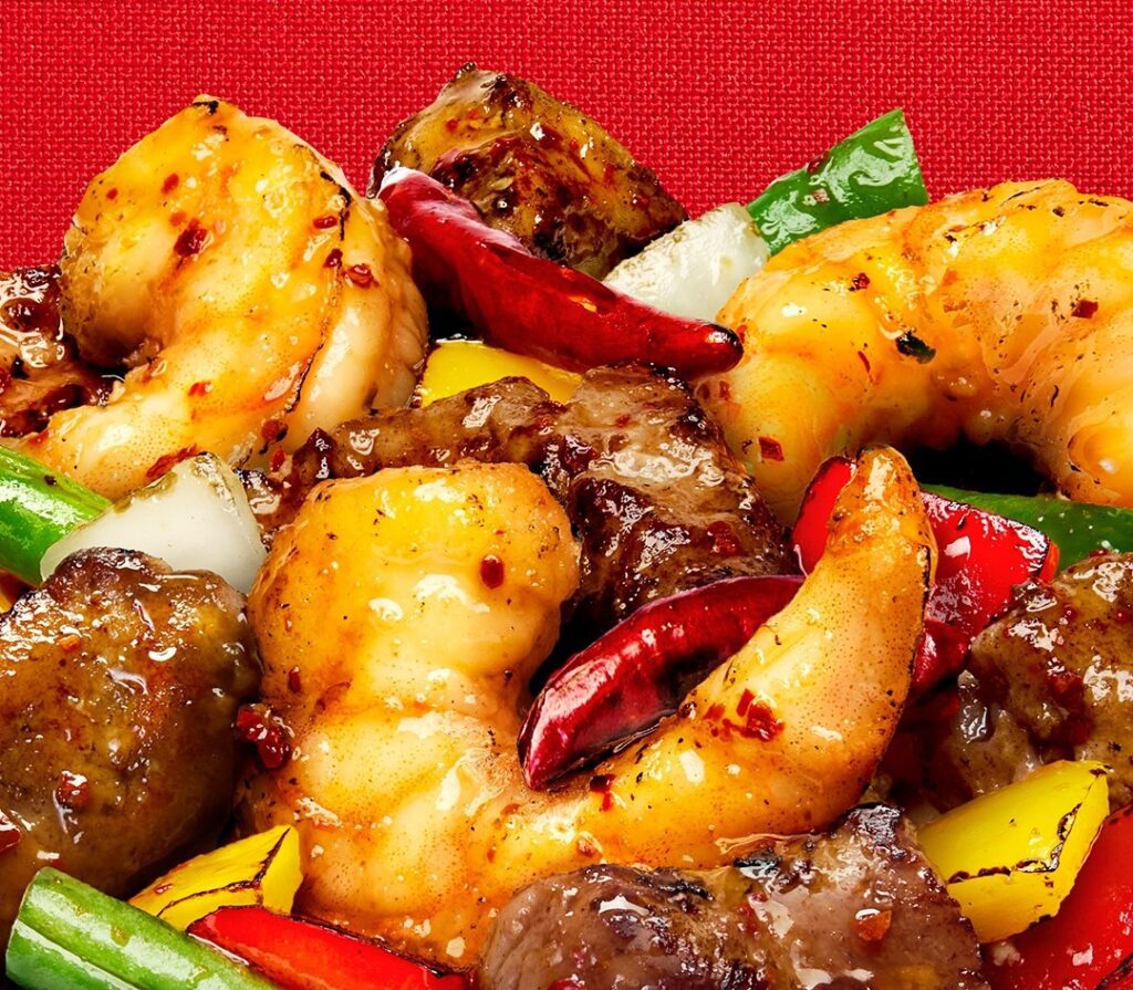 Panda Express has a new limited-time entree: Firecracker Steak and Shrimp. The dish features sirloin steak bites and shrimp that are cooked in a wok with red and yellow bell peppers, onions, green beans and dried chili peppers. Everything is tossed with the restaurant’s firecracker sauce, which includes “fermented black beans and whole dry chili peppers for an extra fiery punch.” It’s available through May 27 or while supplies last.