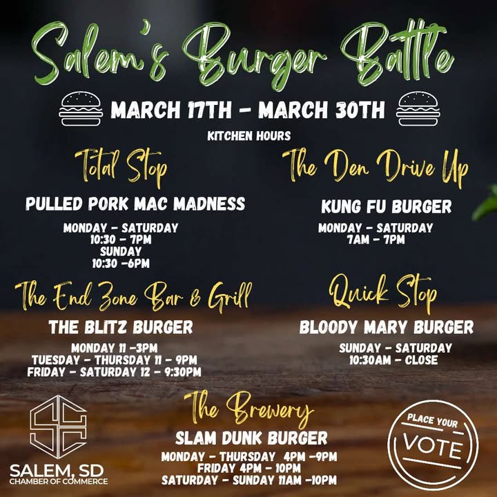 Five businesses in Salem are competing in the second annual burger battle, which runs from Monday through March 30. Participating are The Brewery, The Den Drive Up, The End Zone Bar & Grill, Quick Stop and Total Stop.