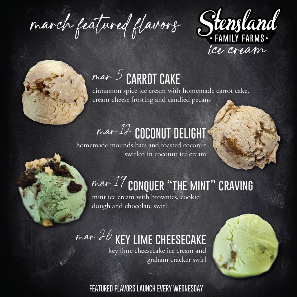 We forgot to fill you in last week on Stensland Family Farm’s featured weekly ice cream flavors for March. You might have missed out on carrot cake, but here’s what’s available now and what’s coming.
