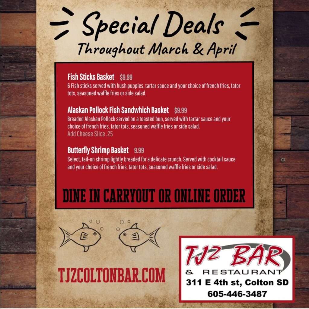 - TJz Bar & Restaurant in Colton is offering special prices on its fish and shrimp baskets through April.