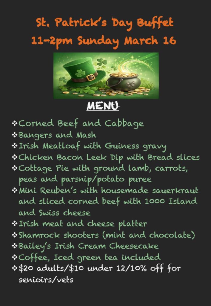 And if you want to celebrate on the actual day, A Taste of Country Catering will be at the Old Courthouse Museum’s annual celebration of traditional Irish music. The free event is from 5 to 7 pm. Monday. The menu includes Irish colcannon, beef stew with Irish soda bread, brats, hot dogs, frosted shamrock cookies and chocolate Guinness cupcakes.