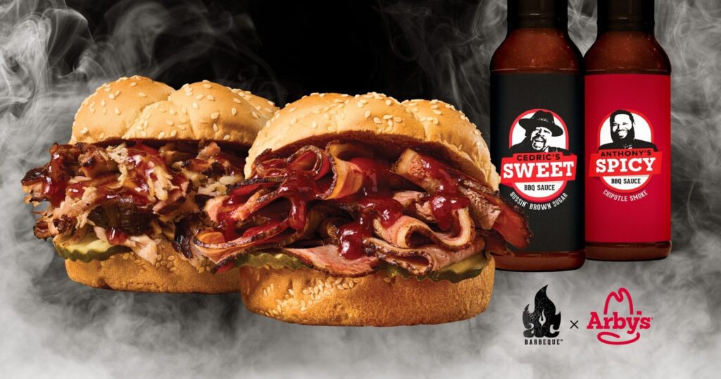 Arby’s has two new sandwiches featuring AC Barbeque, a brand of sauces from comedians Anthony Anderson and Cedric the Entertainer. The offerings are a 13-hour hickory-smoked brisket sandwich and a six-hour smoked pulled pork sandwich. The sauces are Anthony’s Spicy Chipotle Smoke Sauce and Cedric’s Sweet Bussin Brown Sugar Sauce.