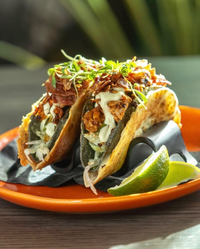 The May taco of the month at Dahlia Kitchen + Bar is Lime Chicken Bacon Ranch Crunch with spit-roasted chicken, bacon, lettuce, tomatillo and avocado ranch.