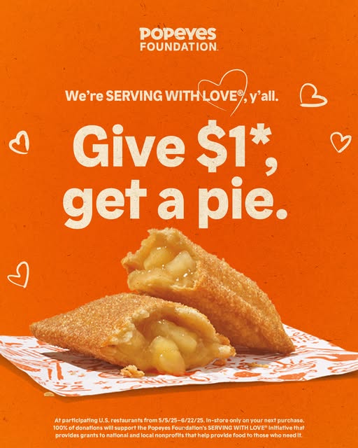 Donate $1 at Popeyes to help national and local organizations that feed the hungry, and get a free apple pie with your next purchase. The offer is good through June 22 on in-store orders.