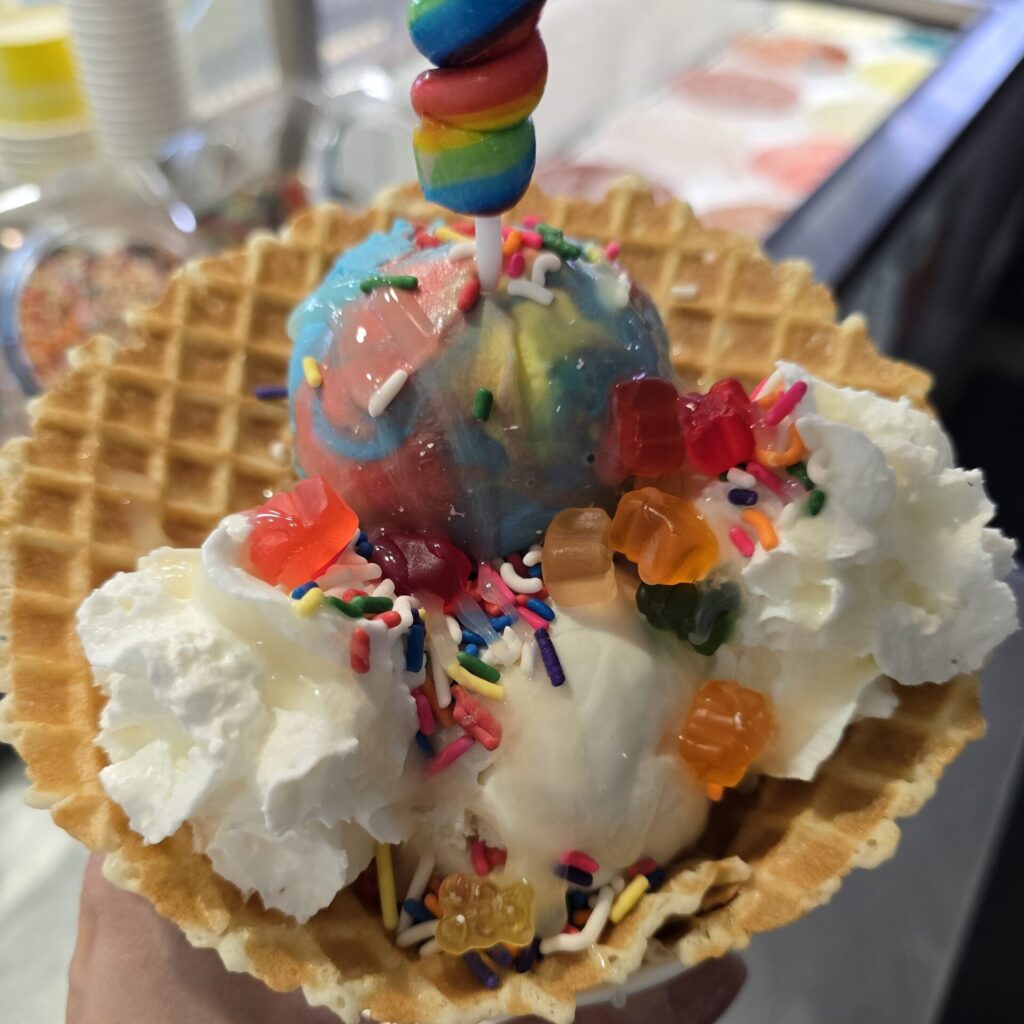 The featured treats for May at Stensland Family Farms are the Krypto Kraze Sundae and Gummy Bear Shake. The sundae has Kryptonite and Farmhouse Original ice creams, gummy bears, a rainbow twist sucker, white chocolate drizzle, whipped topping and sprinkles. The shake is dips of Farmhouse Original ice cream and strawberry sorbet and flavors of orange, lime, lemon and apple, topped with whipped cream and gummy bears.