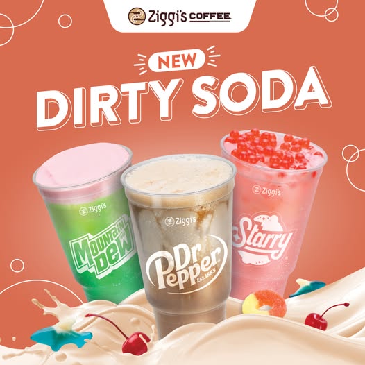 Ziggi’s Coffee has added dirty sodas to the menu. There are more than 50 combinations featuring Dr Pepper, Pepsi, Starry, Mug Root Beer, Mountain Dew and Tropicana Lemonade, with a variety of flavorings and add-ins like boba, gummies and cream. Get them iced, frozen or floated. Click here to see the full lineup.