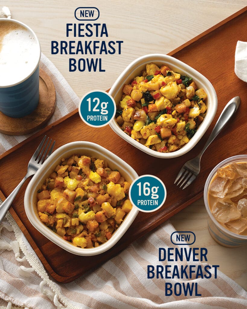 Caribou Coffee has new breakfast bowls. The Denver and the Fiesta are made with cage-free scrambled eggs and potatoes. The Denver has ham, cheddar, green pepper and onion, and the Fiesta has red pepper, spinach, Monterey Jack and salsa verde. The coffee chain also brought back its Cinnamon Sugar drinks, along with a new nitro version and cold foam.