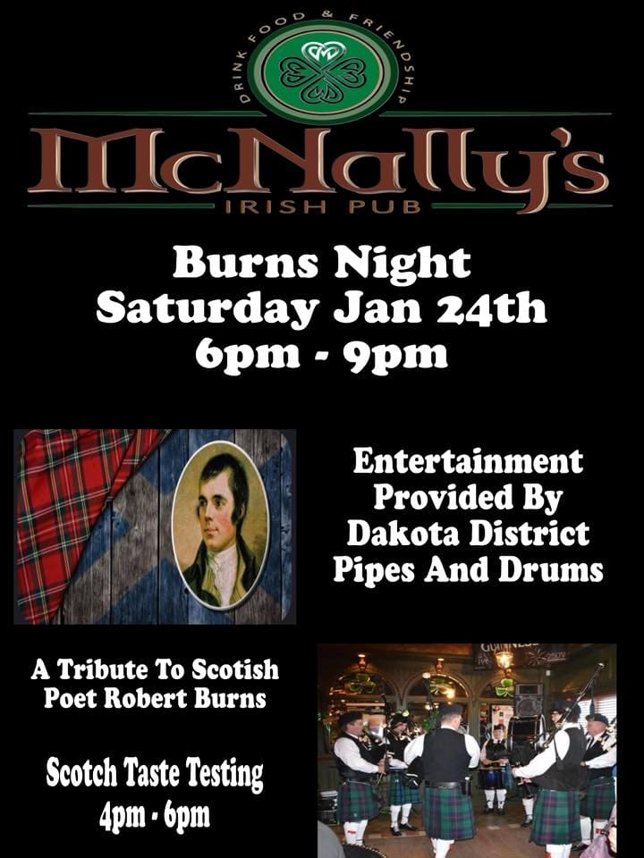 The new owners of McNally’s Irish Pub are keeping up the Burns Night tradition. On Saturday, the celebration of Scottish poet Robert Burns will begin with Scotch tasting from 4 to 6 p.m. After that, witness the dramatic parade of the haggis, the ceremonial slicing of it — all set to the reading of Burns’ works — music from Dakota District Pipes & Drums and plenty of Guinness and whiskey to drink.