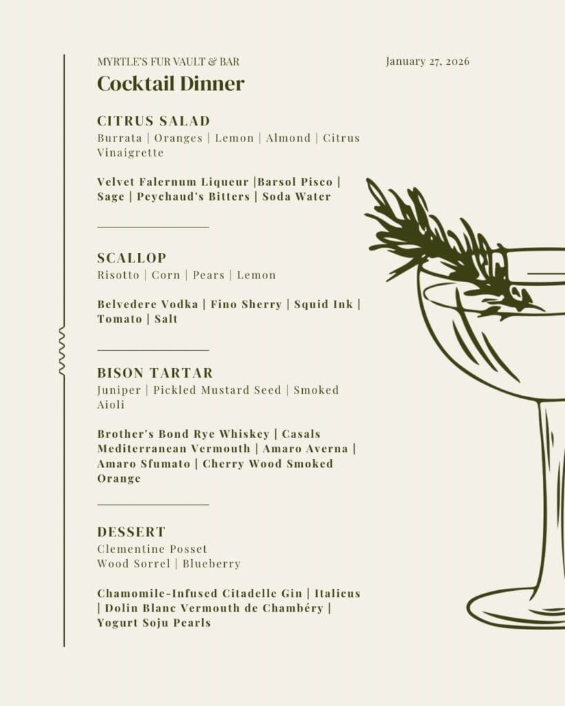 Myrtle’s Fur Vault & Bar is hosting a cocktail dinner at 6 p.m. Tuesday. Each course will be paired with a handcrafted cocktail, with guests able to choose from alcoholic, zero-proof or THC-infused selections. Tickets are $75 plus tax and tip, and reservations are required.