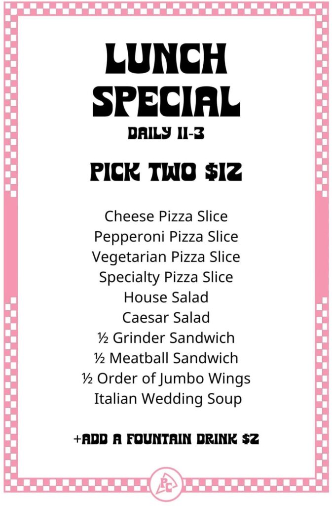 Pizza Cheeks has expanded its weekday lunch offer of pizza by the slice and its Pick 2 for $12 to the weekend. Available slices typically include pepperoni, cheese, specialty and a vegetarian option. Lunch hours are 11 a.m. to 3 p.m. daily.