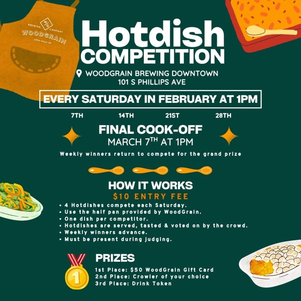 WoodGrain Brewing Co. is organizing a hotdish competition in February at the downtown location. Four casseroles will compete each Saturday at 1 p.m., and the crowd will pick its favorite. Winners will advance to the final March 7. At least one spot remains for each week as of today. Sign up at the taproom.