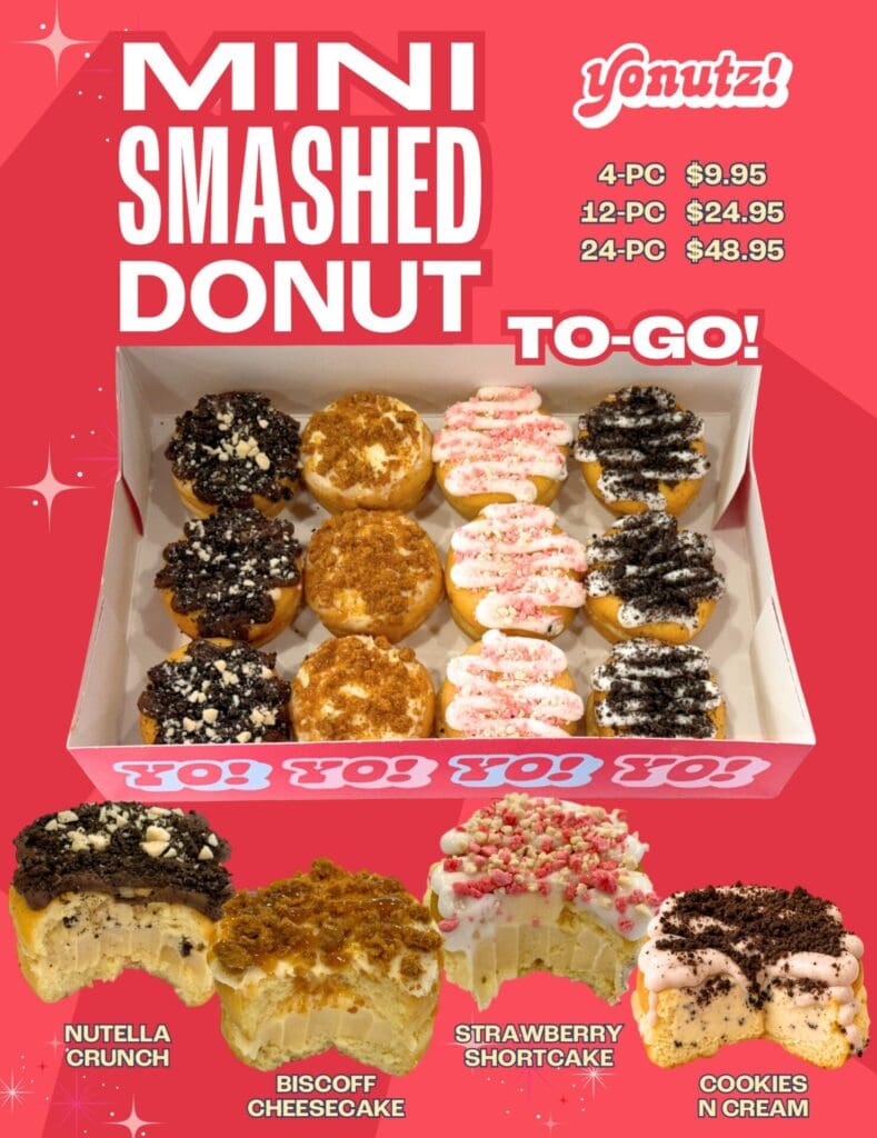 Yonutz now sells mini smashed doughnuts. The ice cream-filled treats come in four flavors: Nutella Crunch, Biscoff Cheesecake, Strawberry Shortcake and Cookies N Cream, and they’re available in packages of four, 12 or 24. These are pre-made, sold frozen and ready for pickup anytime. Let them sit out for about 15 minutes and they’re ready to eat.