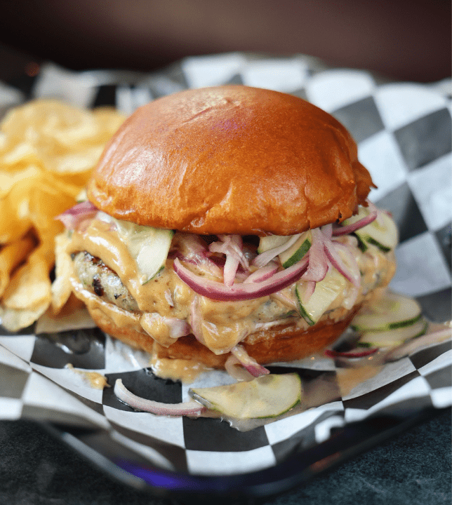 Next door at sister restaurant Big Sioux Burger, the burger of the month is Thai Chicken. A chili-garlic chicken patty with scallions and cilantro is topped with a cucumber, red onion and Thai peanut sauce