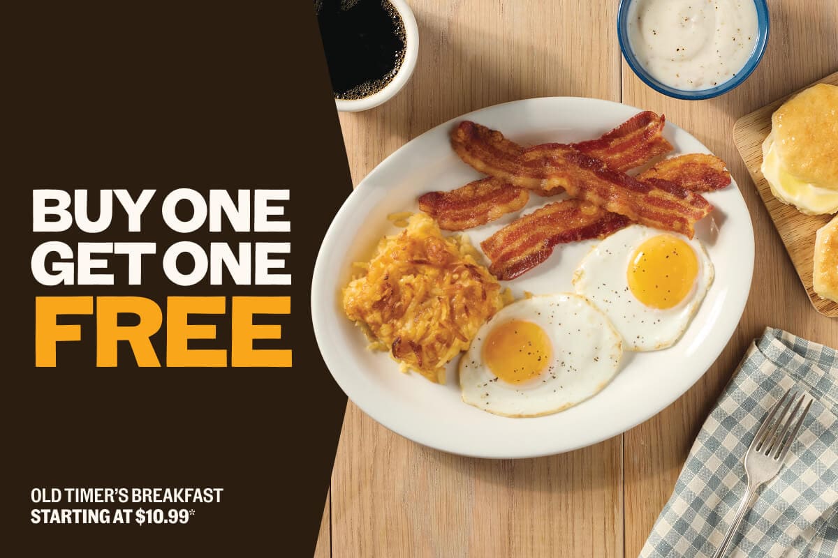 Cracker Barrel has a BOGO offer this Friday through Sunday on the Old Timer’s Breakfast. It includes eggs, grits, biscuits and gravy, sausage or bacon, fried apples or hashbrown casserole.