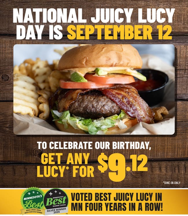 The first Crooked Pint Ale House opened on Sept. 12, so the regional chain has created its own holiday: National Juicy Lucy Day. Get any lucy for $9.12 on Friday – dine-in only.