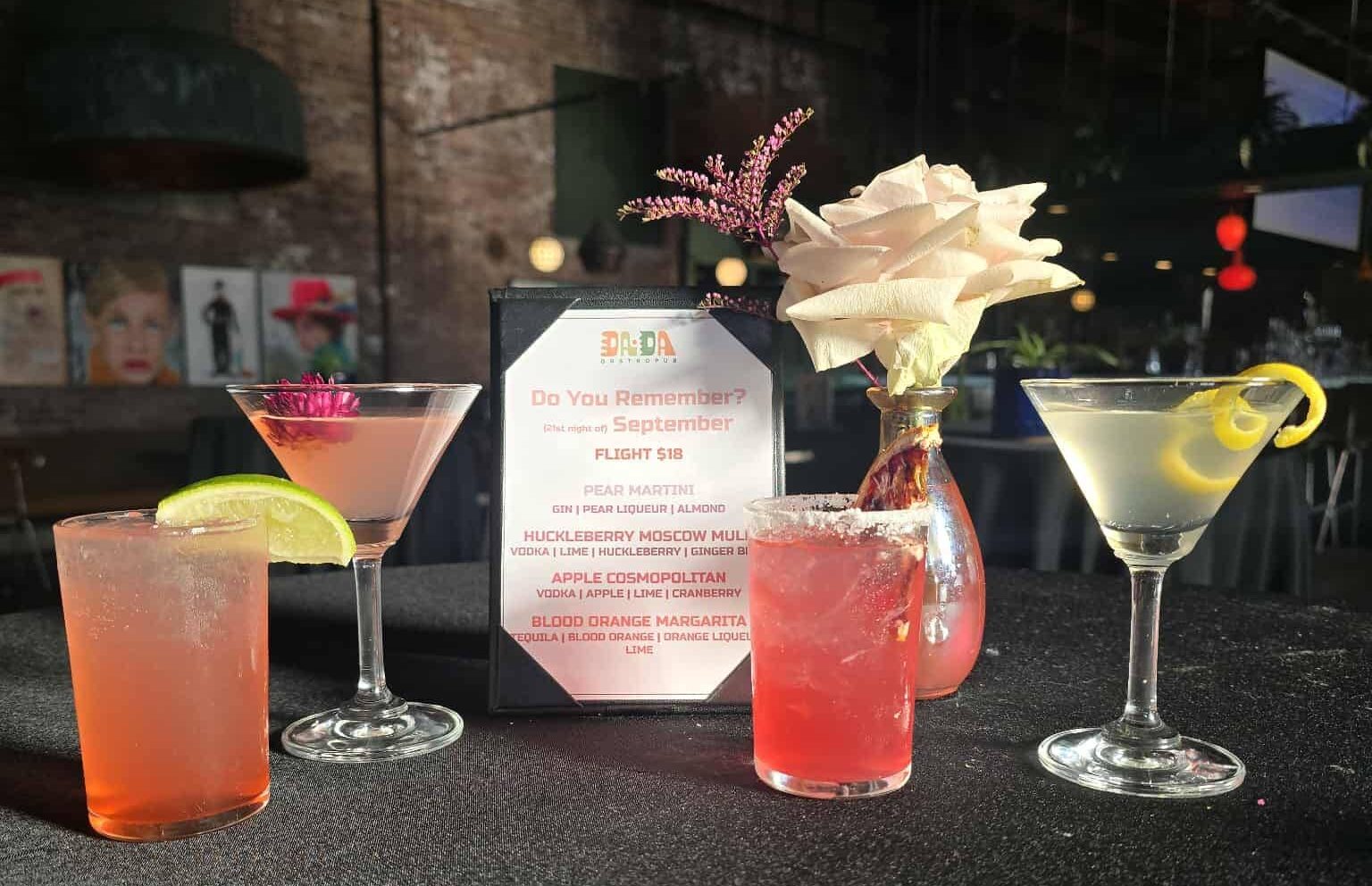 DaDa Gastropub’s cocktail flight for September includes a pear martini, huckleberry Moscow mule, apple cosmopolitan and blood orange margarita.